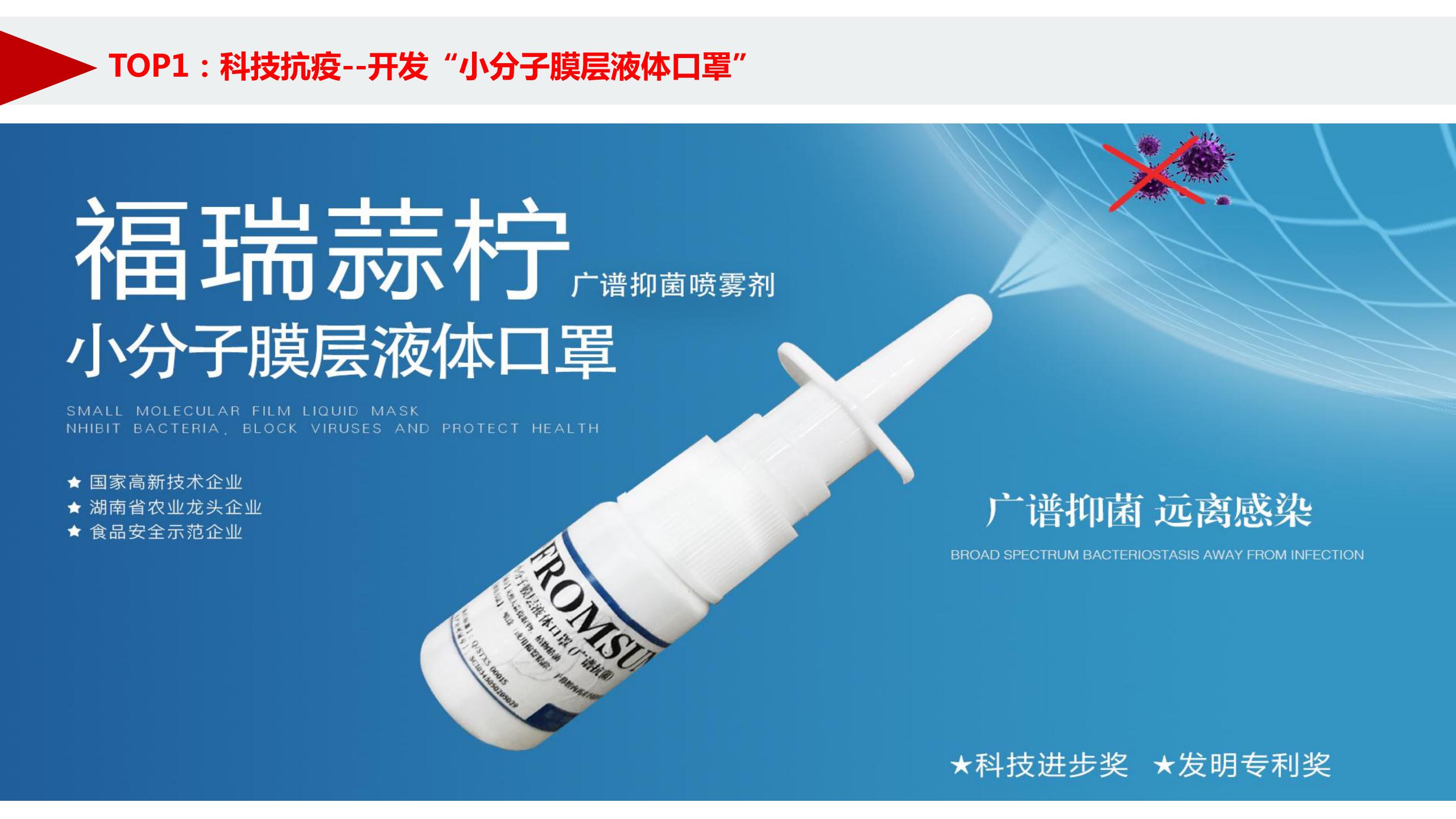 公司自2020年新冠肺炎疫情以來,為響應國家科技防疫的要求,研發(fā)團隊奮力攻關,取得了“小分子膜層液體口罩技術”福瑞蒜檸抑菌液的完整工藝技術和生產(chǎn)參數(shù),已被納入國家重點防疫產(chǎn)品生產(chǎn)企業(yè)目錄。
